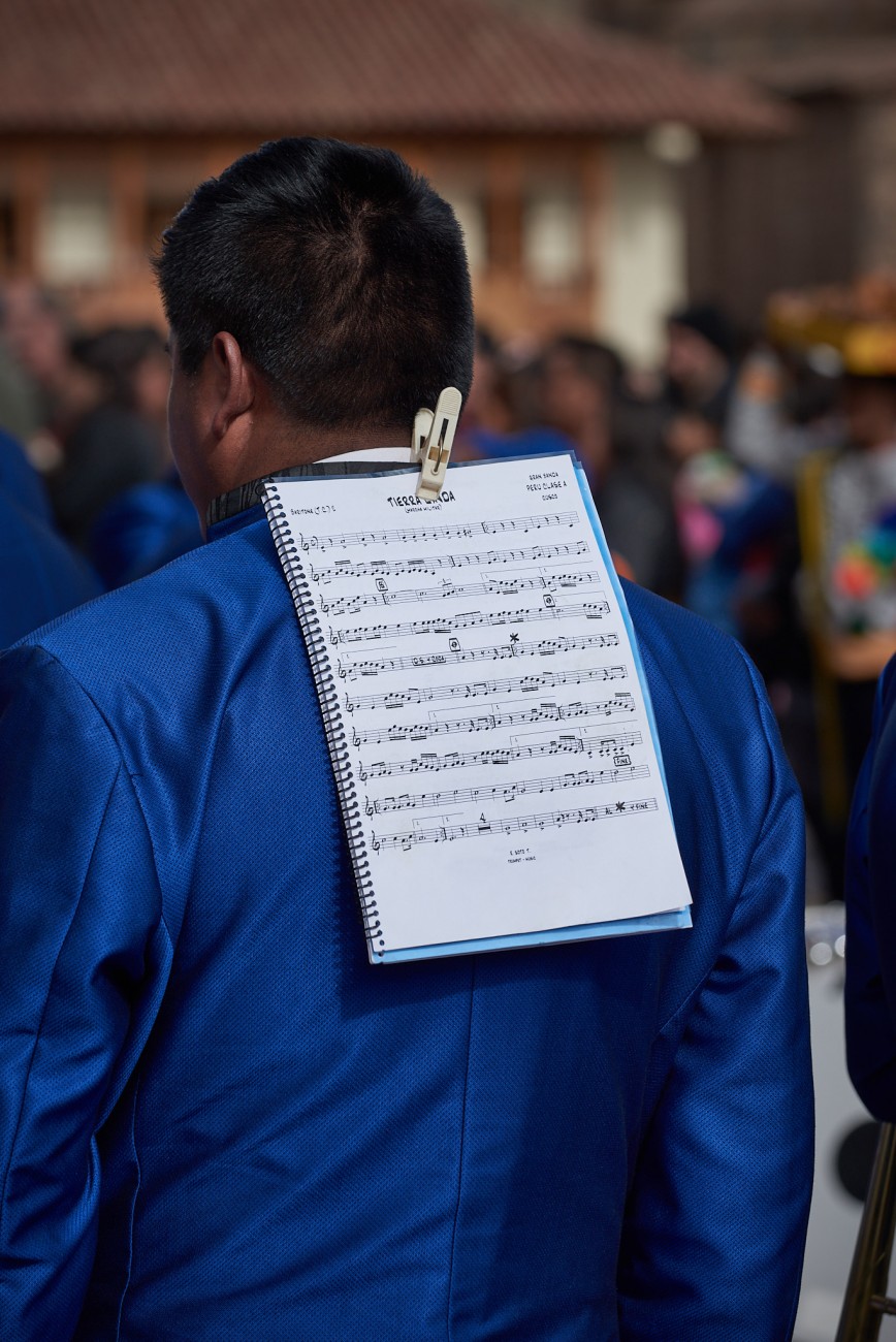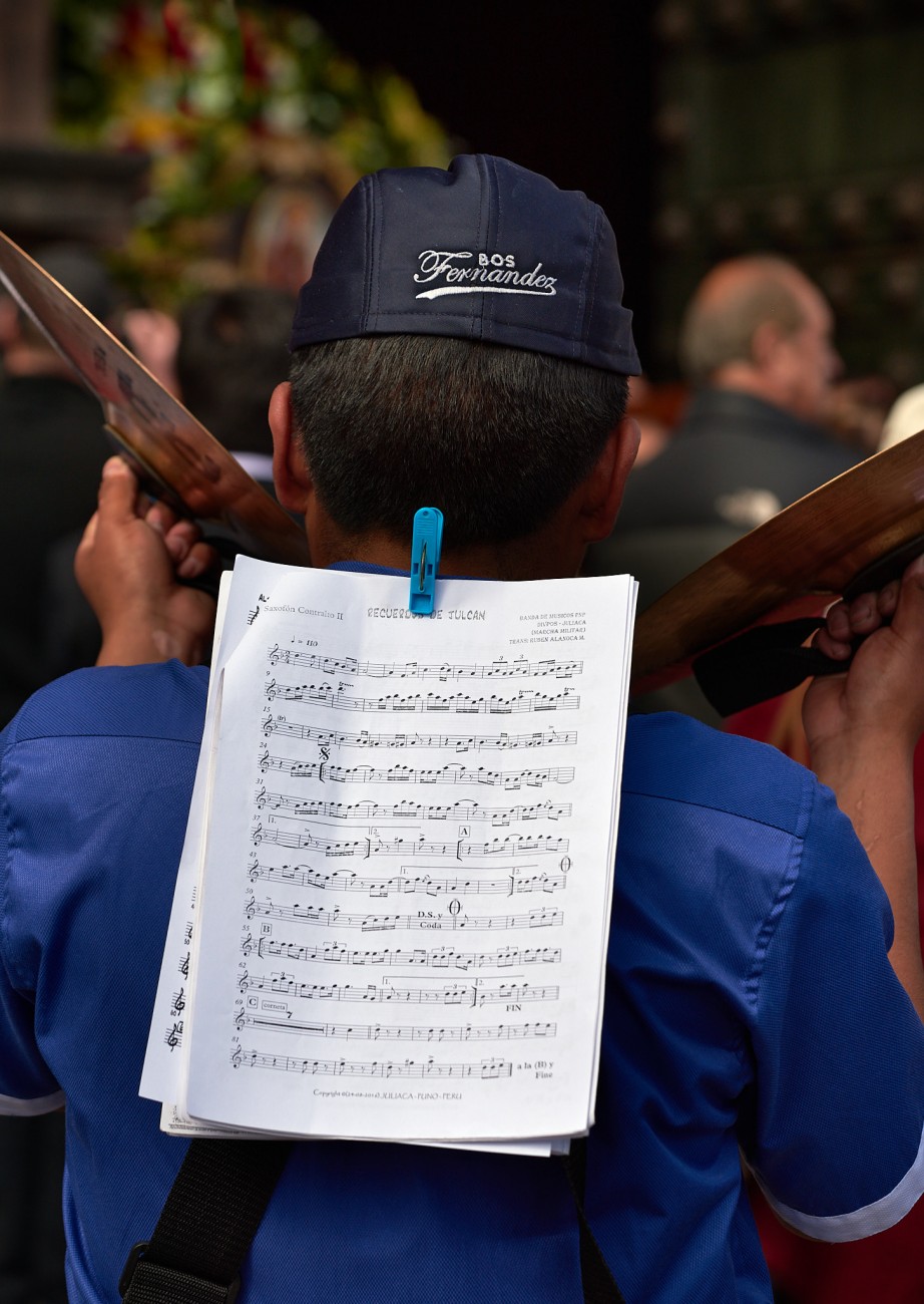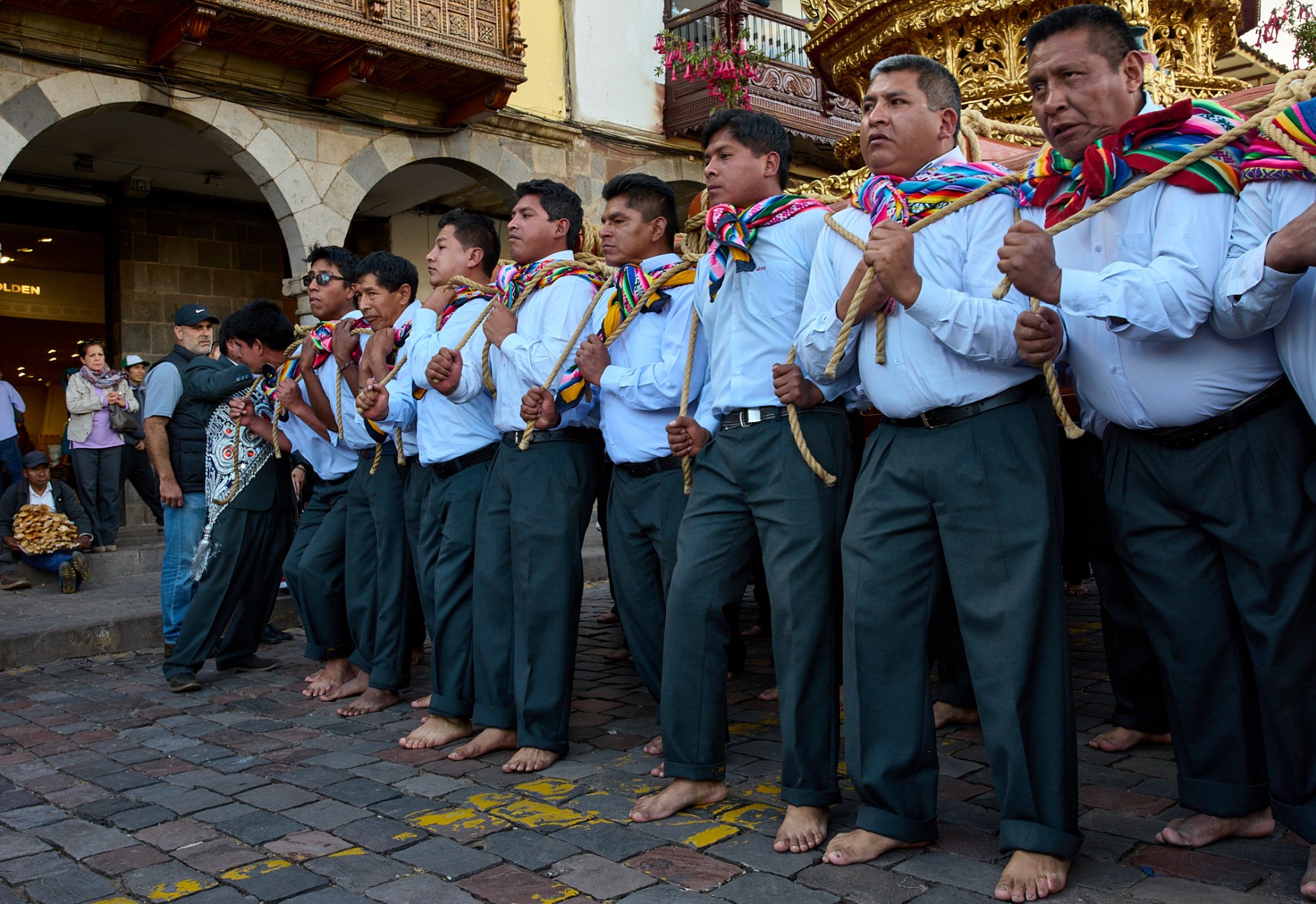 All of this framing the Corpus Christi festivity in Cusco, a perfect example of fusion between Christian devotion and Inca traditions, expression of a singular artistic richness in the clothing and decorations of religious images, moved in step on heavy platforms, supported on stoic shoulders, sometimes projected on bare feet, through the streets of the city, accompanied by the sound of band music. Faces that at times reveal the sublime effort of the long task.
