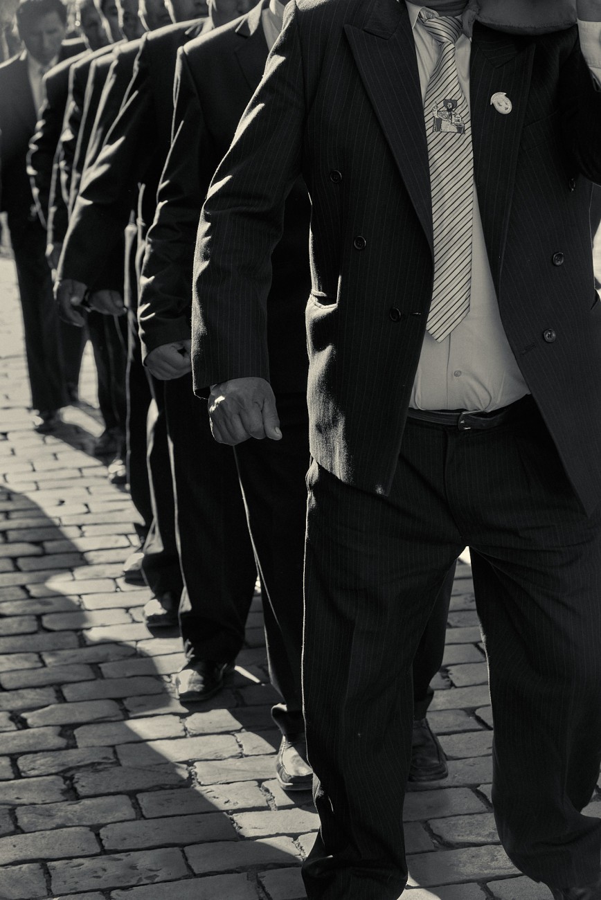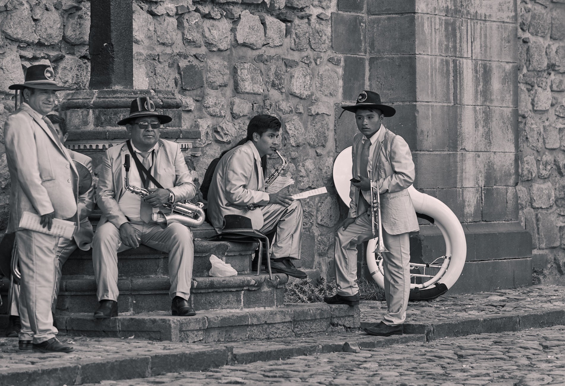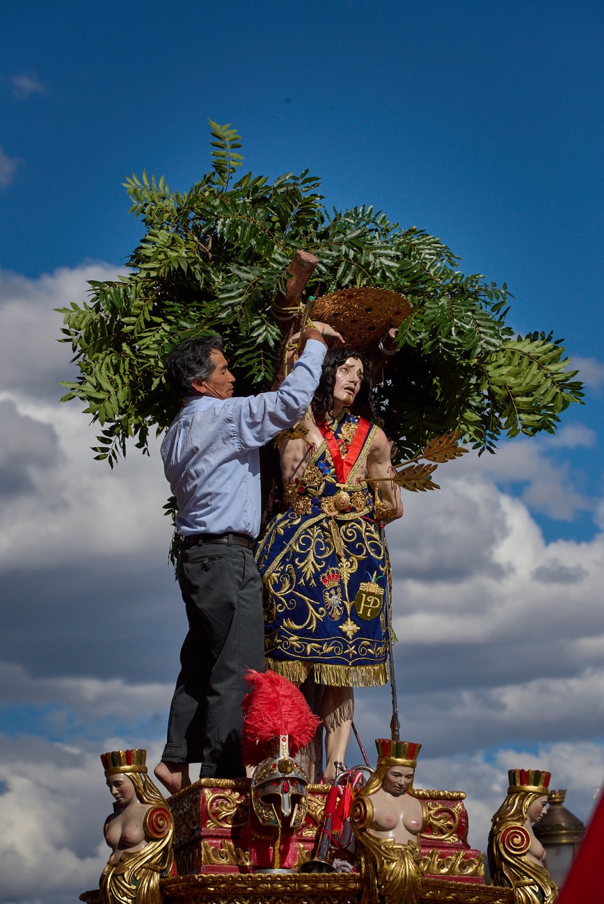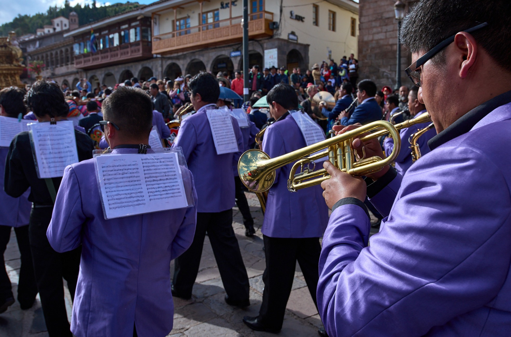All of this framing the Corpus Christi festivity in Cusco, a perfect example of fusion between Christian devotion and Inca traditions, expression of a singular artistic richness in the clothing and decorations of religious images, moved in step on heavy platforms, supported on stoic shoulders, sometimes projected on bare feet, through the streets of the city, accompanied by the sound of band music. Faces that at times reveal the sublime effort of the long task.