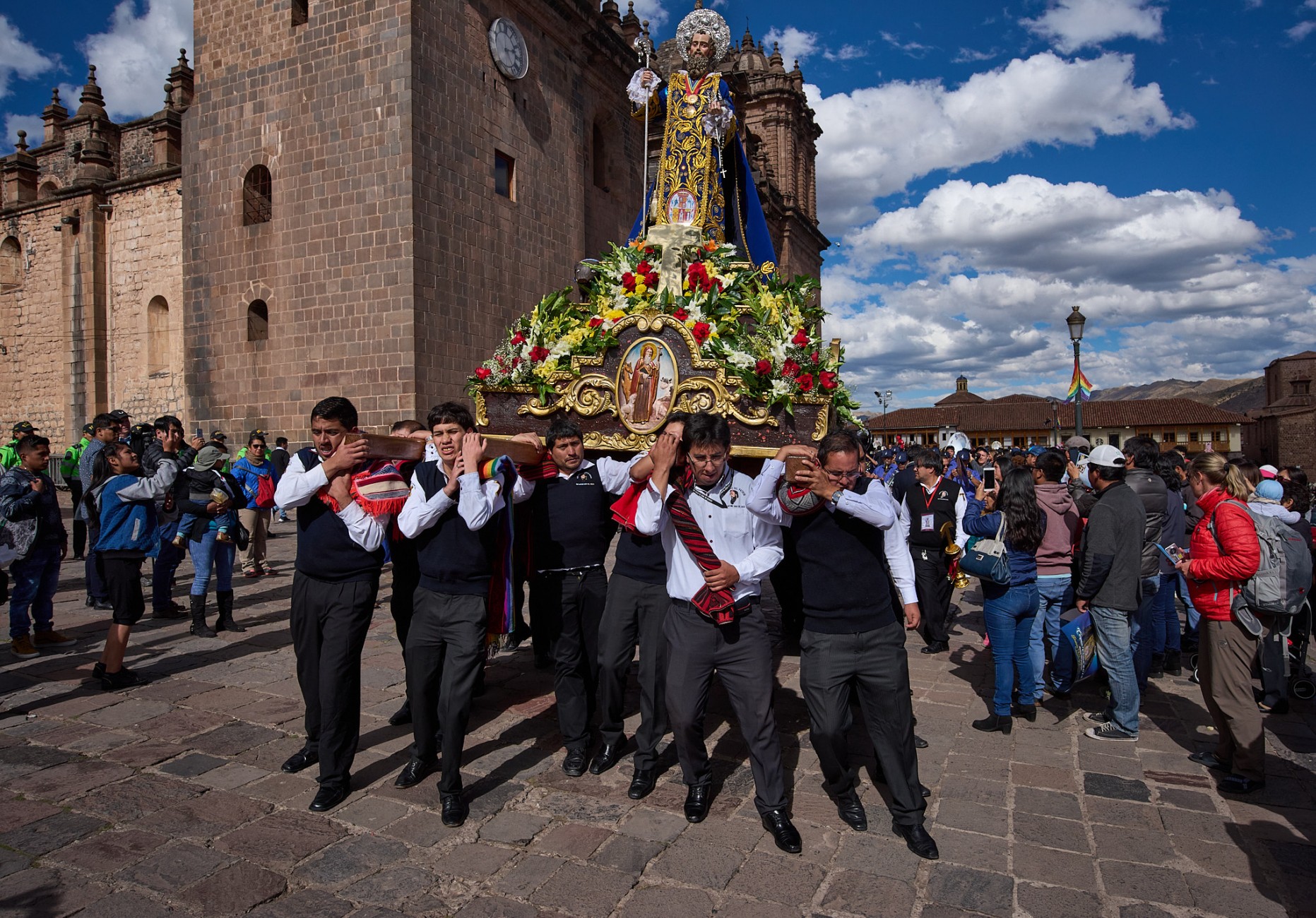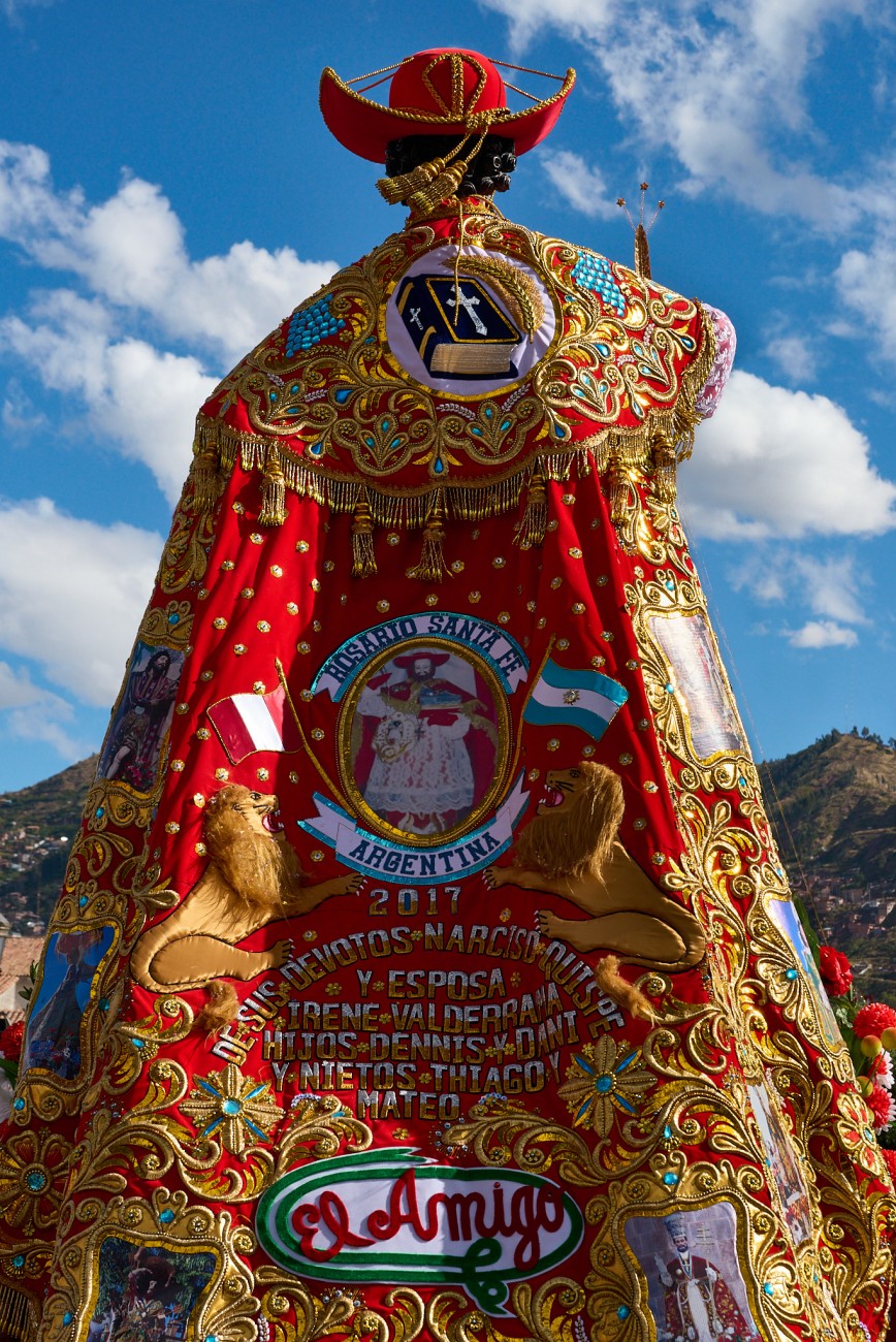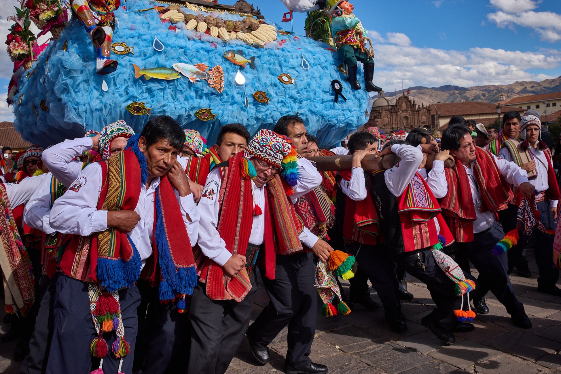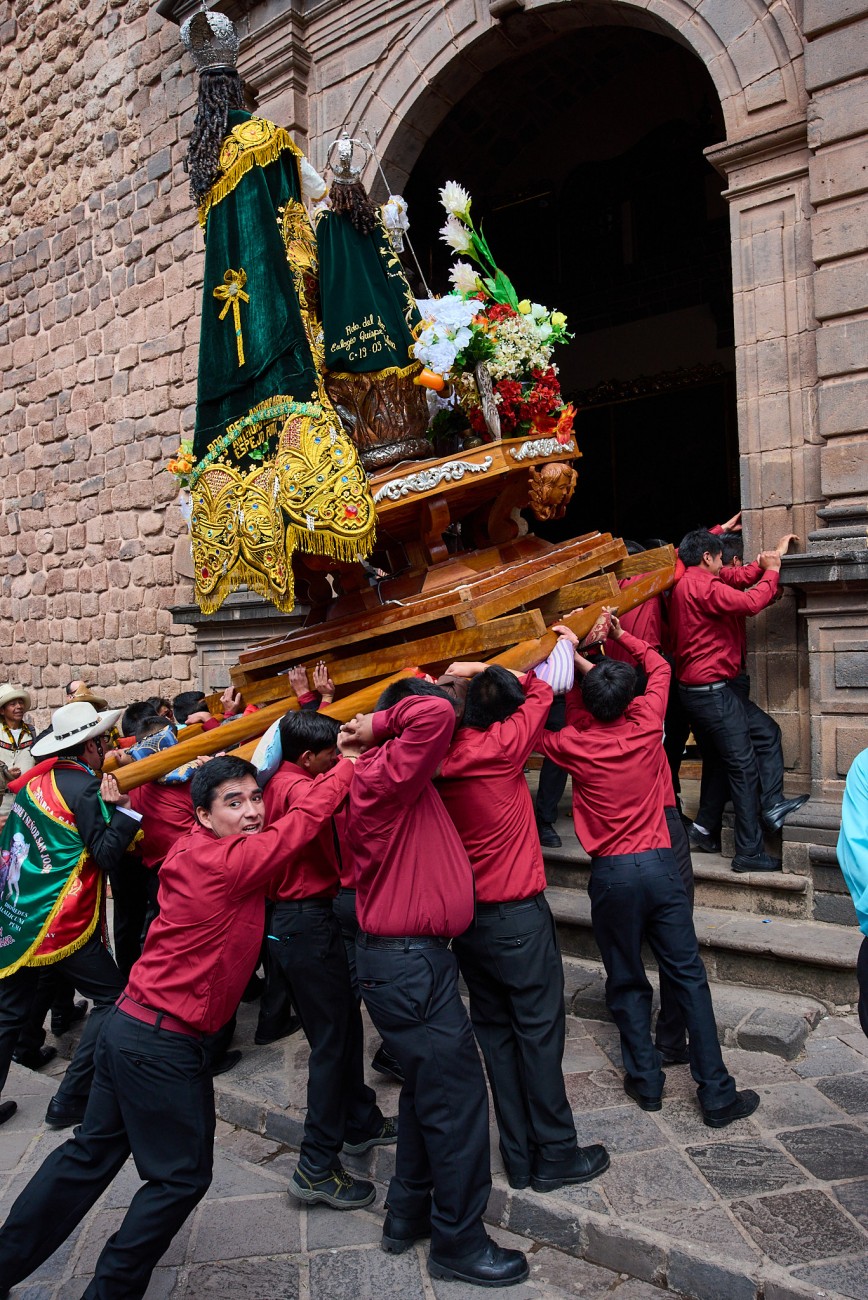 Todo ello enmarcando la festividad de Corpus Christi en Cusco, perfecto ejemplo de fusión entre devoción cristiana y tradiciones incaicas, expresión de una singular riqueza artística en las vestimentas y adornos de las imágenes religiosas, desplazadas al paso en pesadas plataformas, soportadas sobre estoicos hombros, a veces proyectados sobre pies descalzos, por las calles de la ciudad, al son de músicas de bandas. Rostros que por momentos dejan trasuntar el sublime esfuerzo de la larga tarea.