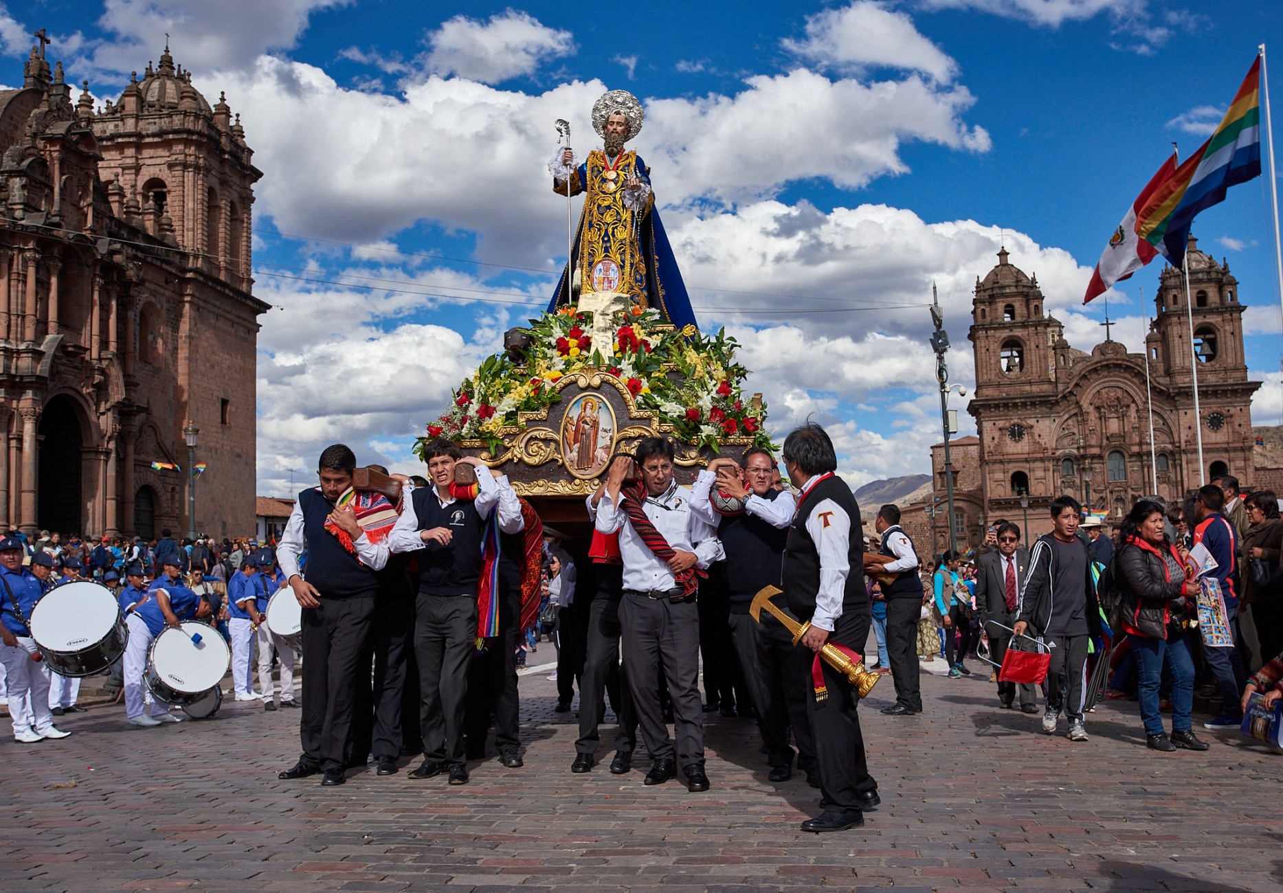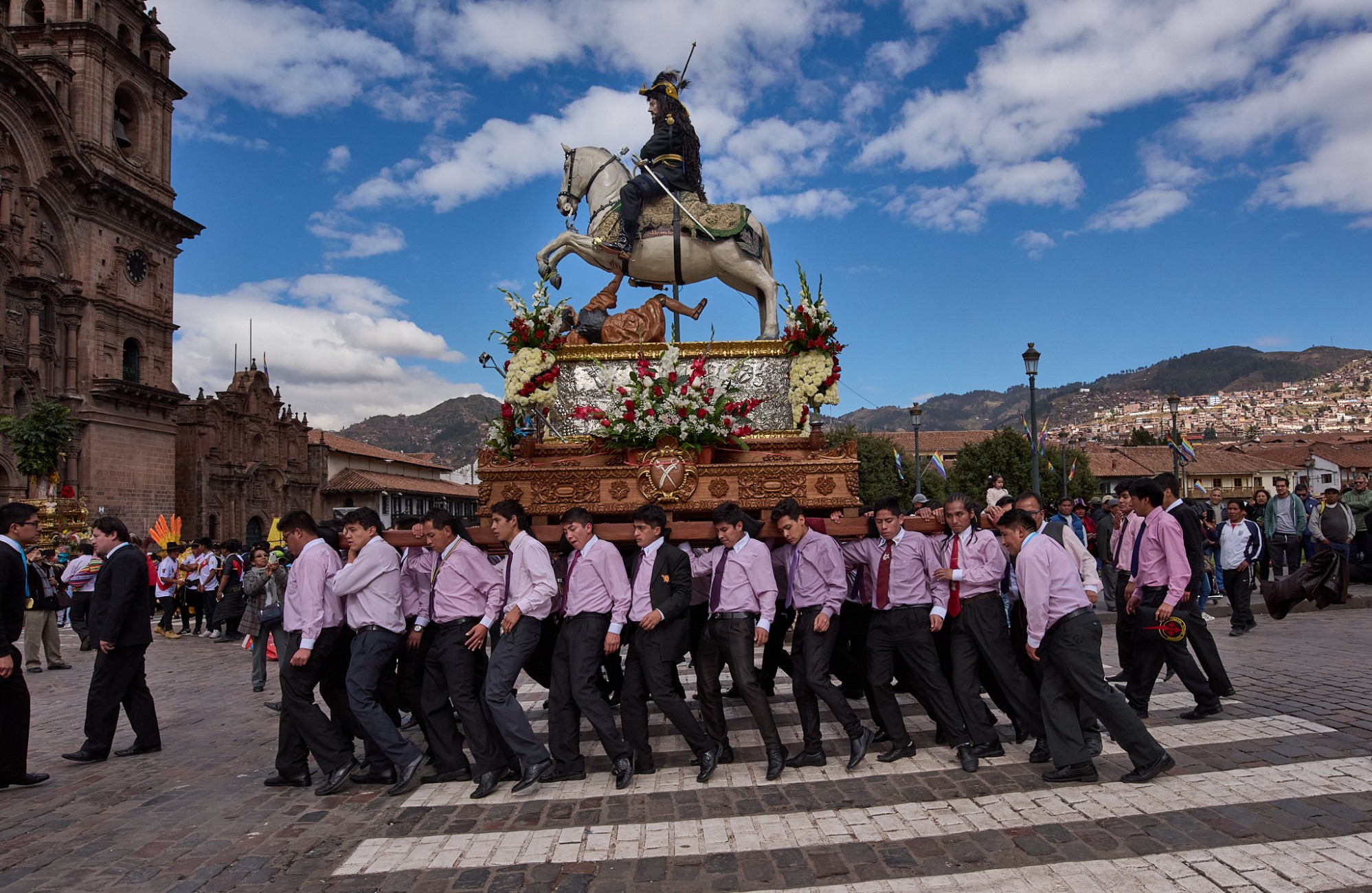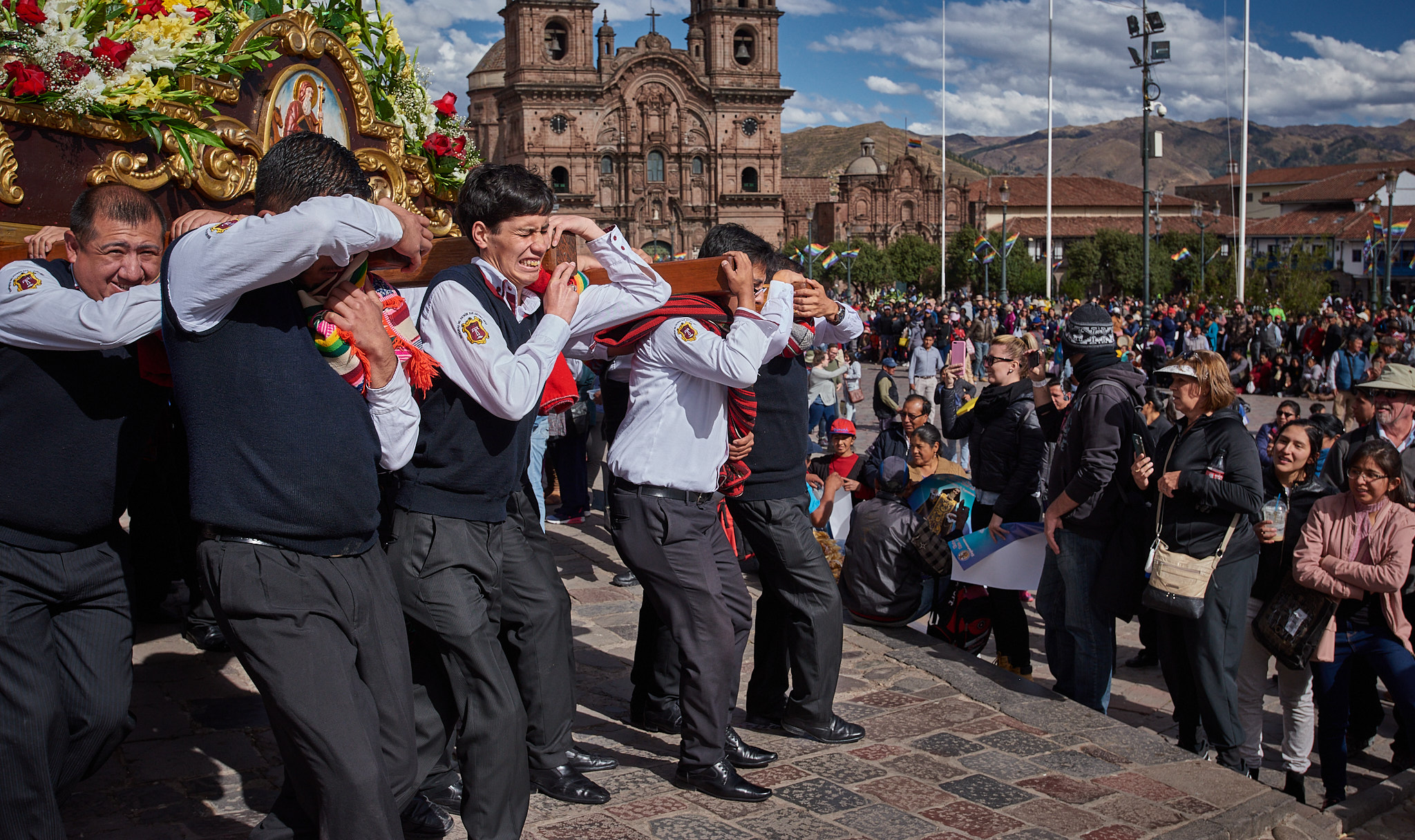 Todo ello enmarcando la festividad de Corpus Christi en Cusco, perfecto ejemplo de fusión entre devoción cristiana y tradiciones incaicas, expresión de una singular riqueza artística en las vestimentas y adornos de las imágenes religiosas, desplazadas al paso en pesadas plataformas, soportadas sobre estoicos hombros, a veces proyectados sobre pies descalzos, por las calles de la ciudad, al son de músicas de bandas. Rostros que por momentos dejan trasuntar el sublime esfuerzo de la larga tarea.